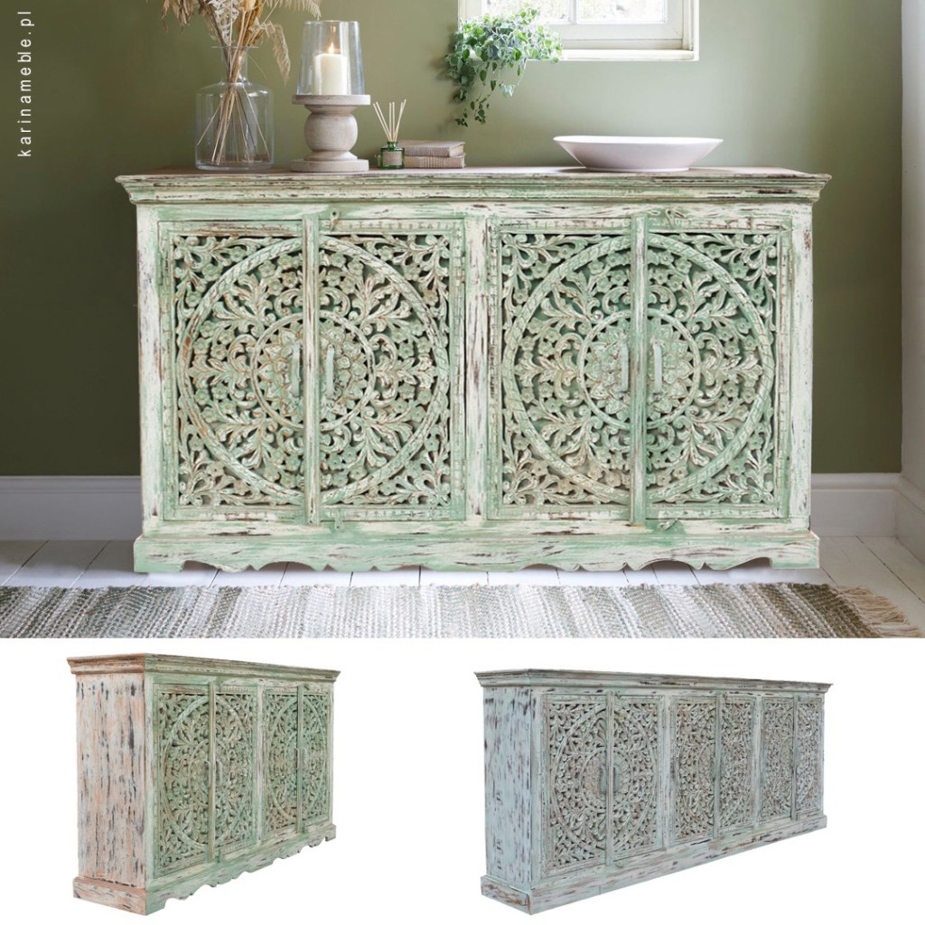Prezentowaną #rzeźbione #komoda #indyjska wykonano #ręcznie z litego #drewna #mango Zdobią ją kwiatowe wzory, komoda piekny, pastelowy lekko #przecierane kolor. #Meble #koloniale wnoszą do #wnętrza powiew egzotyki i stylową elegancję.