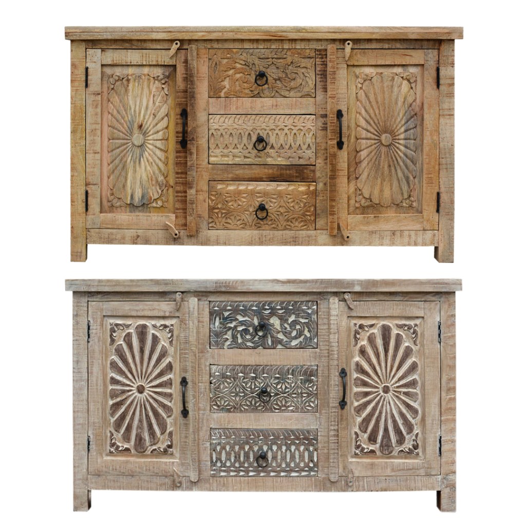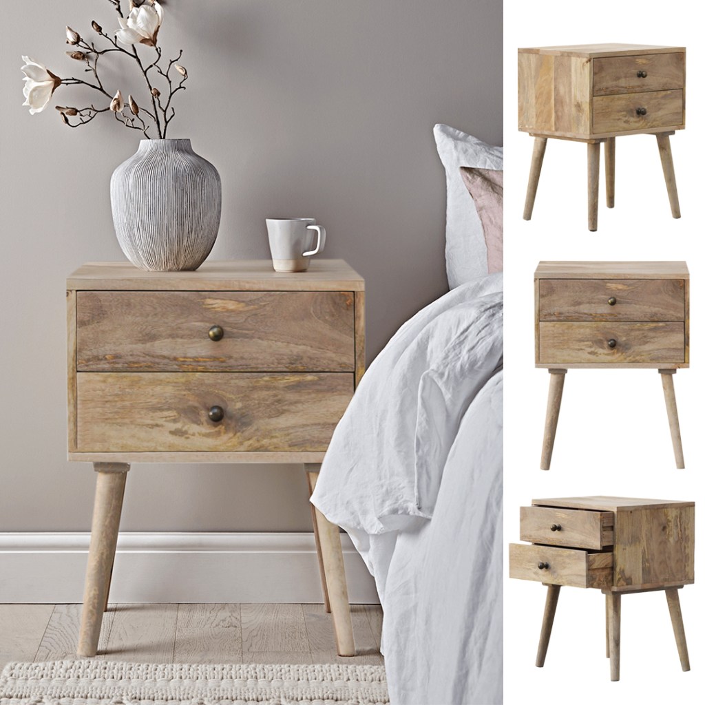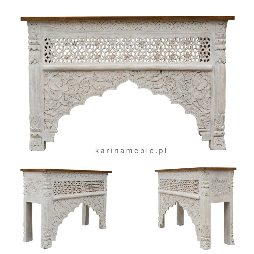 Jeśli bogate, orientale rzeźbione wzory nie do końca są w Twoim guście to mamy również bardziej neutralne propozycje. Prezentowana szafka nocna zrobiona jest z jasnego drewna mango, to delikatny i lekki optycznie meble. Wysokie nogi pokazują piękna podłogę i dodają aranżacji zwiewności.