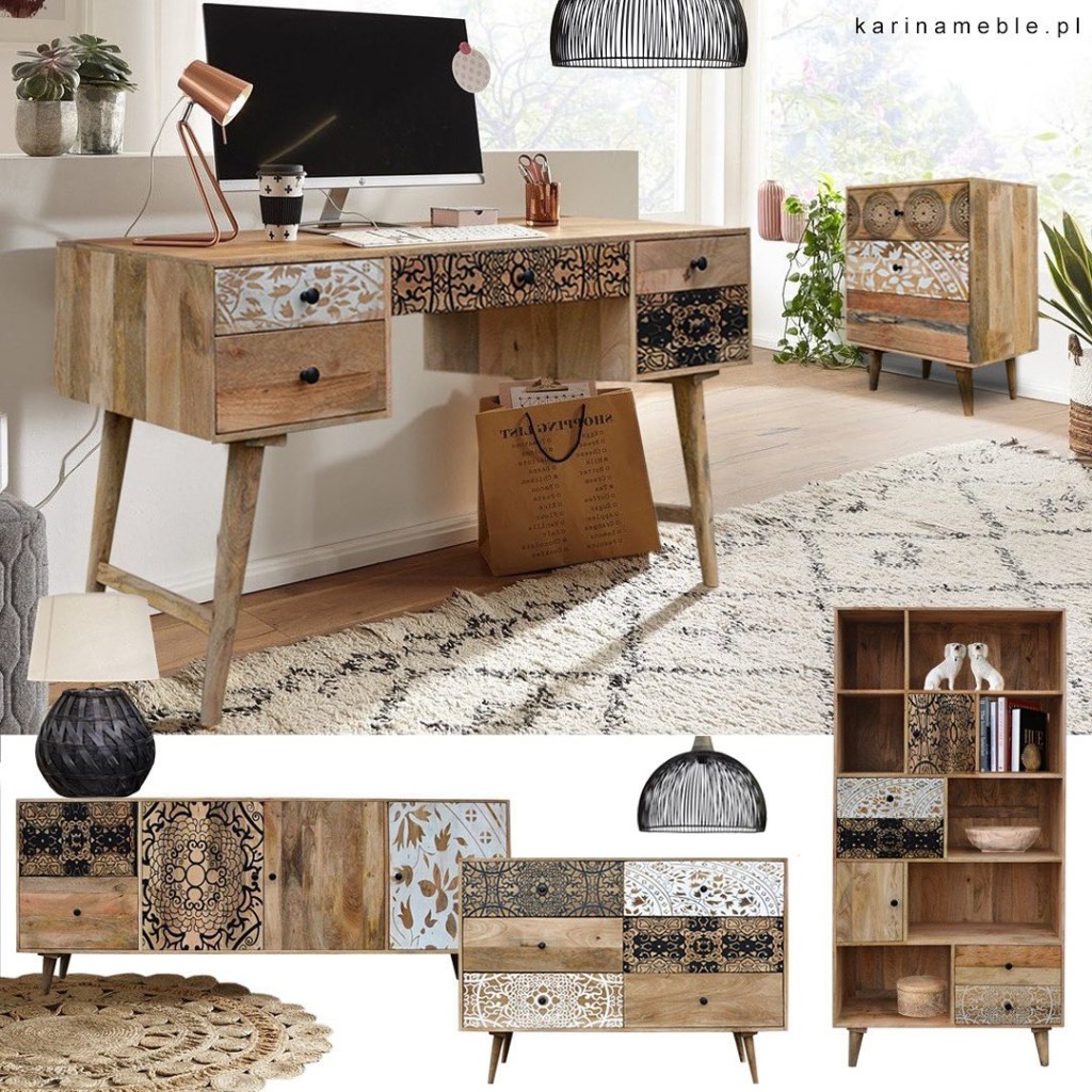 Biurko idealnie wpisuje się w estetykę skandynawską, rustykalną, naturalną oraz boho. Pasuje do jasnych podłóg, lnianych tkanin, wiklinowych dodatków i roślin w ceramicznych donicach. Można je zestawić z przeszkloną witryną, bieloną komodą lub stylową półką z tej samej kolekcji, tworząc spójną i lekką aranżację.