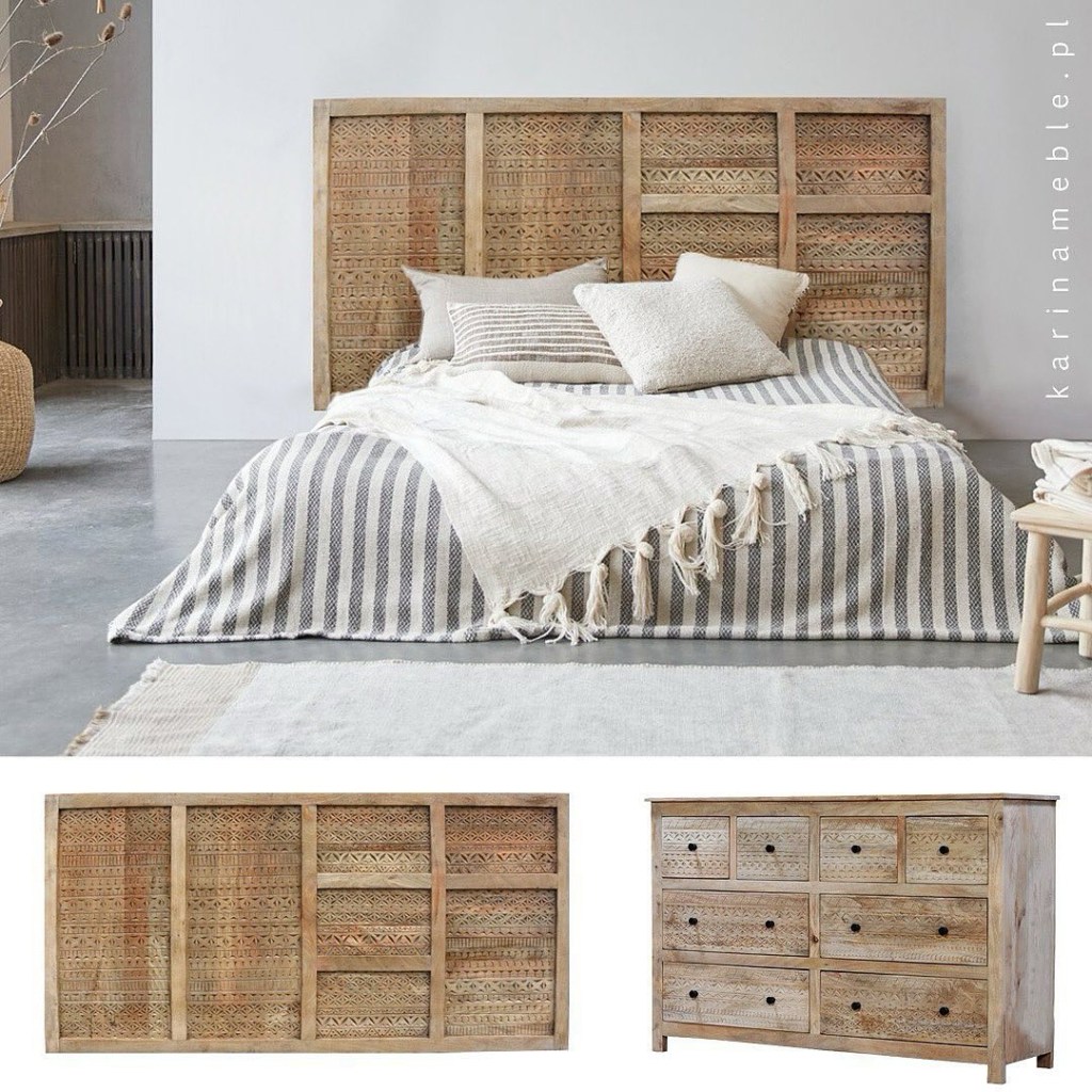 Indyjski panel drewniany – ręcznie rzeźbiony orientalny zagłówek do łóżka z litego drewna mango w stylu boho – Karina Meble Janki