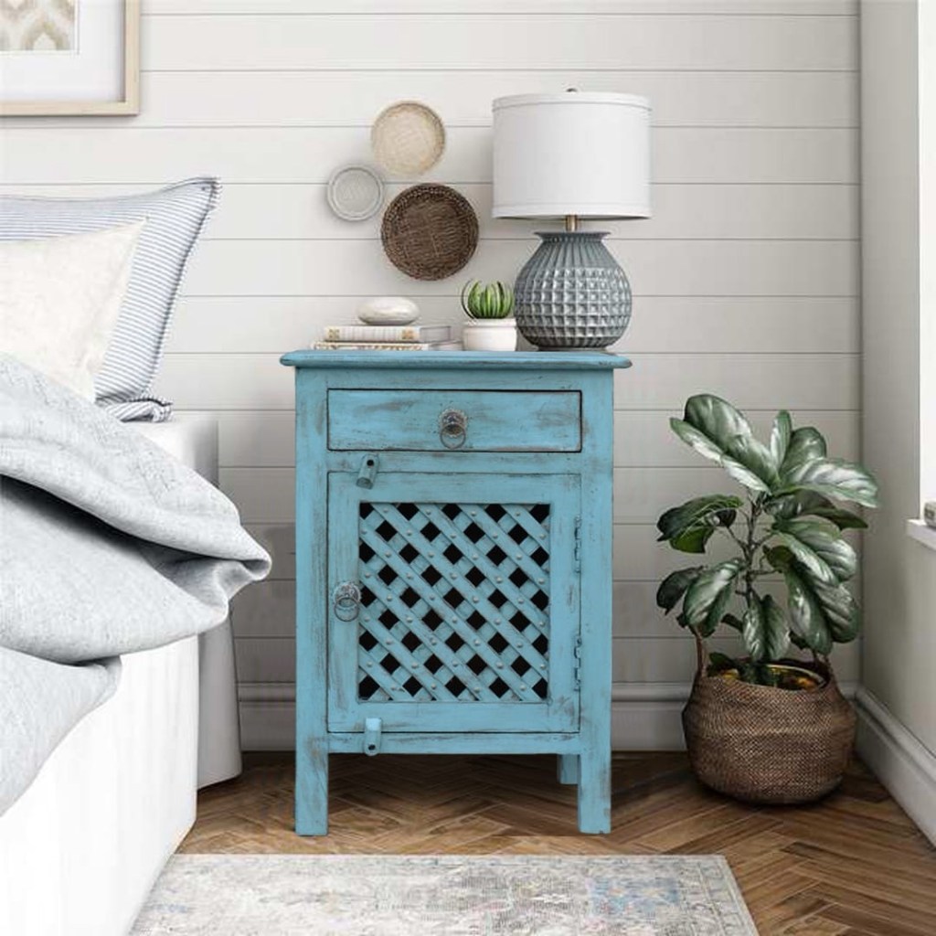 Komplet 2 sztuk Materiał: 100% lite drewno mango Front: ręcznie rzeźbiony Wykończenie: bielone, przecierane Styl: boho / indyjski / vintage Wymiary: szczegóły na stronie produktu