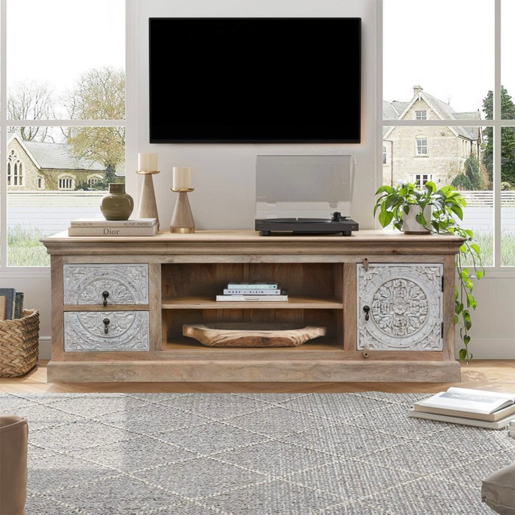Ręcznie rzeźbiona szafka RTV z bielonego drewna mango to wyjątkowy mebel, który wnosi do wnętrza styl orientalny, naturalne piękno oraz funkcjonalność. To doskonały wybór dla osób, które szukają unikatowego akcentu do swojego salonu lub sypialni. Dzięki subtelnym zdobieniom i ręcznej pracy, każdy egzemplarz to małe dzieło sztuki.